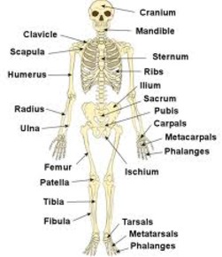 | 1.Support-without bones our bodies would collapse 2.Movement-bones together with muscles allow us to move about 3.Protection-skull protects the brain,rib cage protects heart and lungs,backbone protects spine | Joint=formed where 2 bones meet function:to allow movement Fused join=joint where there is no movement e.g. the skull Ball and socket joint=allows movemnt in many directions e.g. the hip Hinged joint=movement in 1 direction e.g. knee |