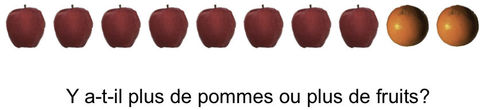 Il dispose sur une table 8 pommes et 2 oranges. Piaget demande tout d’abord à l’enfant ce que sont les pommes et l’enfant répond que ce sont des fruits. Ensuite, il pose la même question et obtient la même réponse pour les oranges. MAIS, quand Piaget leur demande s’il y a PLUS DE POMMES ou PLUS DE FRUITS sur la table, avant l’âge de 7-8 ans, les enfants répondent qu’il y a plus de pommes que de fruits.