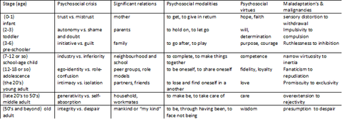 | Neo-Psychoanalytical: Erikson Erikson developed his own theory about personality development from a lifespan perspective, in which he refered to a series of psychosocial stages. He differed from Psychoanalytical Theory by focusing less on pschosexual stages, more on conscious thought and interpersonal relations. Unlike Freud's stages which ended early, Erikson's stages continued througout life. He focused on Identity Crisis (sense of self) & male-female differences in Personality. | Infancy-Trust vs. Mistrust (hope) Toddler-Autonomy vs. Doubt (will) Early Childhood-Initiative vs. Guilt (purpose) School age-Industry vs.Inferiority (competence) Adolescence -Identity vs. Role confusion (Fidelity) Young Adulthood-Intamacy vs. Isolation (love) Adulthood- Generavity vs. Stagnation (care) Old Age-Ego Integrity vs. Despair (wisdom) Trouble with any of the stages could potentially impact on the rest of an individuals life. |