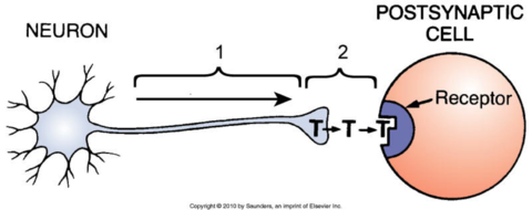 What are the two basic steps in the process by which the neuron influences the behavior of the postsynaptic cell? Step 1) Axonal conduction Step 2) Synaptic transmission