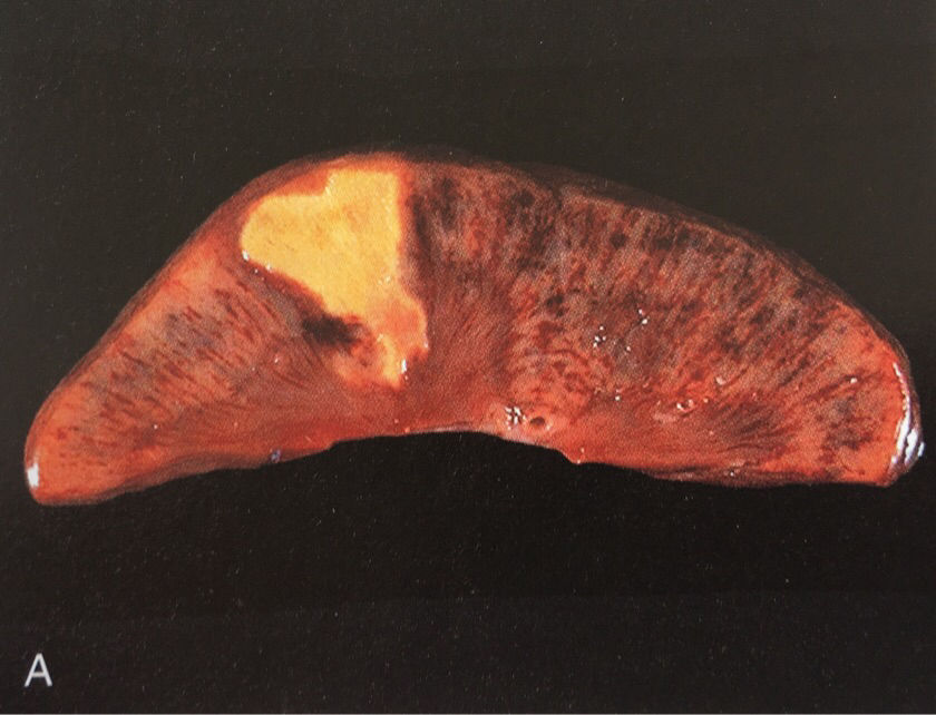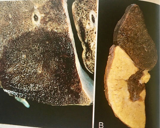| Sabendo que o órgão da esquerda é um pulmão e o da direita um baço, diga qual lesão cada um tem | Pulmão: infarto vermelho Baço: infarto branco |