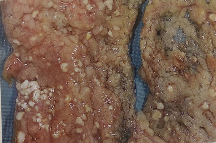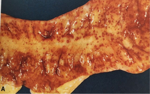 | Que lesão é encontrada aqui? Ela é consequência de que? | Hemorragias petequiais no cólon, uma consequência da trombocitopenia. |