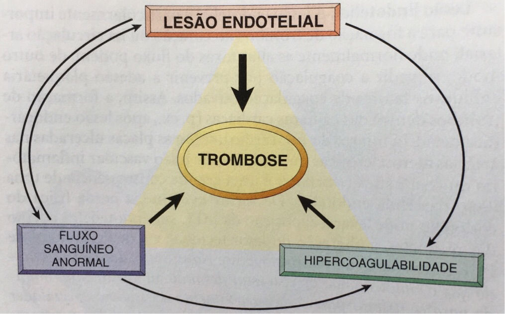 | Descreva o que compõe a tríade de Virchow | Lesão endotelial, alteração do fluxo, hipercoagulabilidade. |