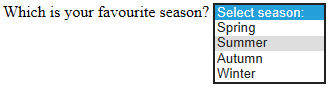 <select name="seasons"> <option> Select season:</option> <option> Spring</option> <option> Summer</option> <option> Autumn</option> <option> Winter</option> </select> |