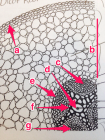 a- epidermis b-cortex c-pericycle d-xylem e-endodermis f-vascular cambium g-phloem |