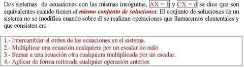 | El método de eliminación de Gauss-Jordan | El método consiste en transformar un sistema de ecuaciones lineales cualquiera en un sistema equivalente que sea escalonado reducido. |