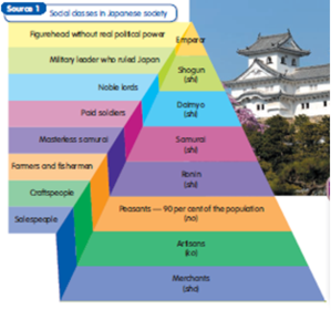 At the top was the Emperor who was just a figurehead of society and a symbol of religion. He has no real political power. Next were the Shogun who was the military leader and had the most power over society. Then came the Daimyo who were the noble lords. Then were the Samurai who were paid soldiers. The samurai lived by the code of Bushido and were probably the social class that honoured their religion and country the most. Below the Samurai were the Ronin, and they were the masterless Samurai. Then came the peasants who were farmers and fishermen and were 90% of the population. |
