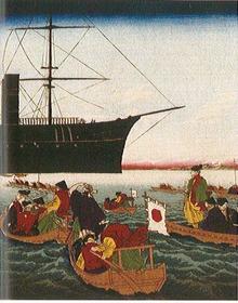 The photo shows the arrival of Commodore Mathew Perry and the Japanese ships watching it enter the harbour. |