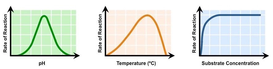 | Explain the effects of temperature | At a low temperature, there is less kinetic energy so the particles move slowly and there is less enzyme substrate collisions so less enzyme substrate complexes At the optimum temperature, there is more kinetic energy so the particles move faster and there are more collisions so more complexes made At a high temperature, the enzyme is denatured because the active site changes shape and the substrate can no longer bind |