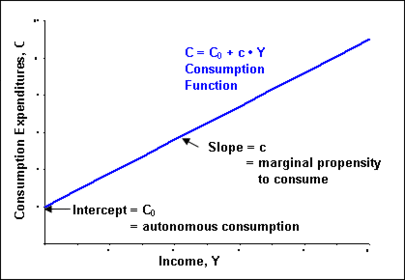 | What is the the Keynesian consumption function equation ? | C= a + cY Aggregate consumption = Autonomous consumption + Income-induced spending |