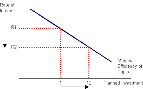 | On a marginal efficiency of capital curve, the equilibrium level of aggregate investment is determined on the graph at what point ? | Where the marginal efficiency of capital equals the cost of borrowing I = R |
