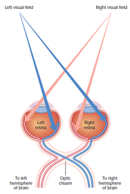 | Hemispheres & visual fields | right visual field --> left half of each retina --> left hemisphere left visual field --> right half of each retina --> right hemisphere |