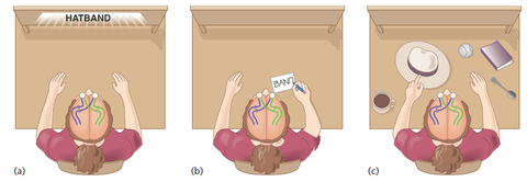 | Effects of damage to the corpus callosum | Right visual field (band) --> left retinas --> left hemisphere (language) --> writes out band using right hand Left visual field (hat) --> right retinas --> right hemisphere (visual) --> left hand points to hat |