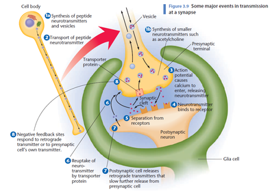 | Sequence of events at the synapse | 1) Synthesis of neurotransmitters (axon terminals) and neuropeptides (cell body) 2) Transport of neuropeptides to axon terminal/dendrite 3) Action potential travels down axon --> voltage gated calcium channel opens --> Ca^2+ enters the axon terminal --> neurotransmitters released in vesicles into the synaptic cleft 4) Released molecules attach specifically to receptor molecules and change activity of postsynaptic neuron 5) Neurotransmitter molecules separate from receptors 6) Neurotransmitter molecules taken back into presynaptic neuron for recycling or diffuse away 7) Some post synaptic cells send reverse messages to control further release of neurotransmitters by presynaptic cells. |