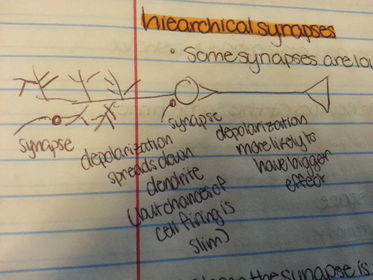 | Hiearchical synapses | - some synapses are louder than others - closer the synapse is to the axon hillock, the more potent it is (faster it reaches somewhere) |