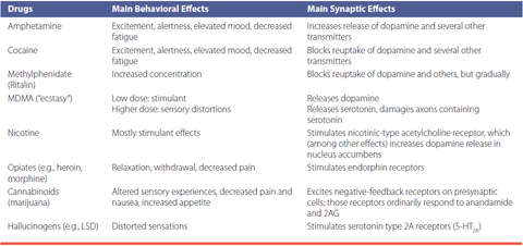 | Stimulant drugs | - increase excitement, alertness, and activity while elevating mood and decreasing fatigue - impair attention and learning - correlated with "impulsiveness" 1) amphetamine 2) cocaine 3) heroin 4) morphine 5) methylphenidate (Ritalin) 6) methylenedioxymethamphetamine (MDMA) |