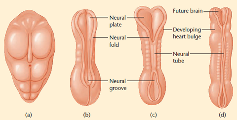| Development of the brain | neural plate --> folds in --> neural groove --> closes up at top --> neural tube |