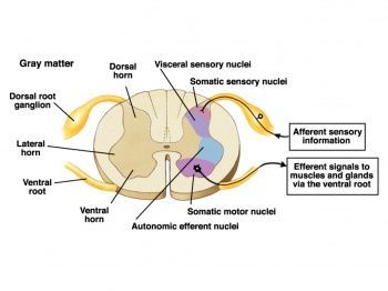 | Path of information in the spinal cord | IN: sensory information --> dorsal root --> dorsal horn OUT: motor information --> ventral horn --> ventral root |