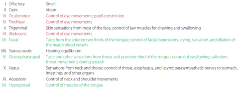 | Cranial nerves | nerves that control sensation from the head, muscle movements in the head, and much of the parasympathetic output to the organs |