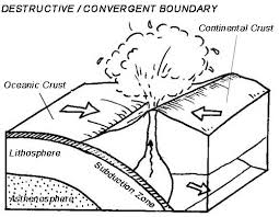 | What happens on a destructive plate boundary? | Oceanic and continental plates collide, the heavier oceanic plate sinks beneath the continental plate into the subduction zone and the melted crust rises causing volcanic eruptions. Example is the Pacific Ring of Fire. |