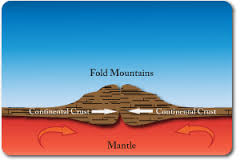 | What happens at a collision plate boundary? | Two continental plates push together, the plates buckle and form fold mountains and also causing violent earthquakes. |