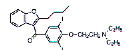 | amiodarone antiarrhythmia class 3 coronary vasodilator iodine containing agent--> affect thyroid hormone activity (hypo and hyperthyroidism) t1/2 = 25d (very long) for life threatening ventricular arrhythmia | |