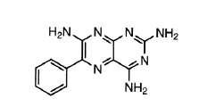 | triamterene diuretic potassium sparing agent non-aldosterone receptor antagonist 2,4,7-triamino-6-phenylpteridine active incomplete absorbtion extensive metabolism into active (20% excreted unchanged, 80% metabolised t 1/2= 4h SE: hyperkalemia, renal stones | |