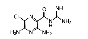 | amiloride diuretic potassium sparing agent non-aldosterone receptor antagonist aminopyrazine or pyrazinoly guanidine active mostly charged incomplete absorbtion renal excretion unchanged t 1/2= 21h SE: hyperkalemia | |