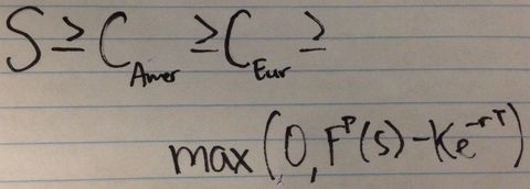| No arbitrage, calls | [C(K1) - C(K2)]/(K2-K1) > [C(K2) - C(K3)]/(K3-K2) |