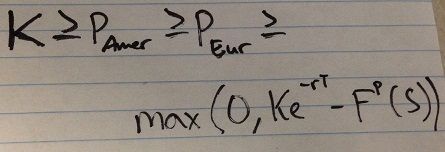 | No arbitrage, Puts (K1 < K2 < K3) | [P(K2) - P(K1)]/(K2 - K1) < [P(K3) - P(K2)]/(K3 - K2) |