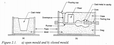 | As the pouring of molten metal starts, the air and gasses occupying the mould cavity should be: | Should be taken out from the mould cavity using either the porosity of sand moulds or by drilling vent holes into the mould. |