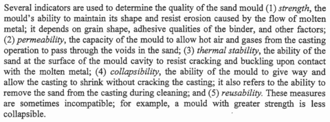 | Four main indicators of a good quality sand mould are: -strength - impermeability - collapsibility - permeability - thermal stability - conductivity | Strength, permeability, thermal stability, collapsibility. Also: reusability. |