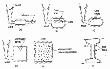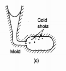 | Casting defect cold shots are: | when splattering occurs during pouring, globules of metal are formed that become entrapping in the casting. Pouring procedures and gating system designs can prevent this defect. |