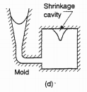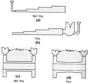 | Why are b and d correct designs of castings and riser locations? | Risers are located at the heaviest sections of the casting and thus able to supply molten metal to the thinner and farthest sections of the cast. Supplies metal to the casting during solidification and thus will contain the final void. |