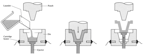 | Squeeze casting is where: | a metered quantity of metal is poured into a preheated mould. The mould is then closed with a punch and pressure is applied until solidification is complete. |