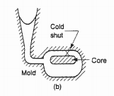 | Casting defect cold shut occurs when: | two portions of the metal flow together, but there is a lack of fusion between then due to premature freezing. - causes are similar to misrun |