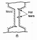 | Casting defect hot tears (hot cracking) occurs: | when casting is restrained from contracting by an unyielding mould during the final stages of solidification or early stages of cooling after solidification. - manifested by separation of the material at a high point of high tensile stress caused by the metals inability to shrink naturally. |