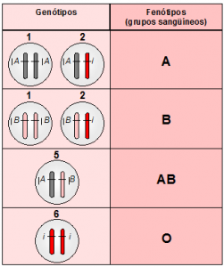 - 6 genótipos (IAIA, IAi; IBIB, IBi; IAIB; ii)
