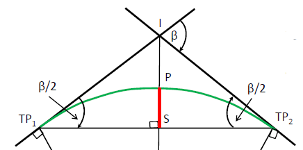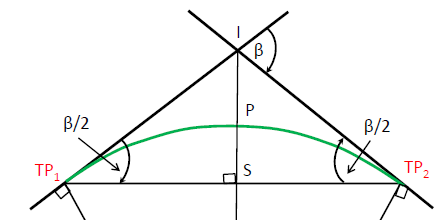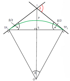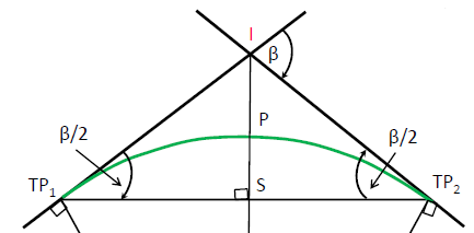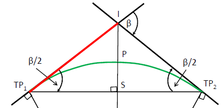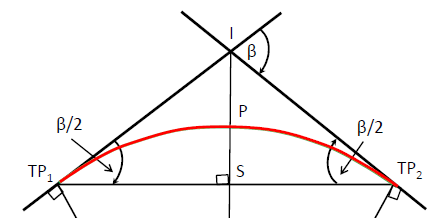 | Tangent points | TP1 and TP2 are the tangent points where the circular curve touches the straights |