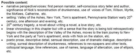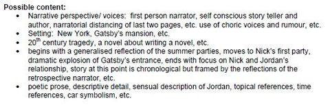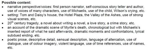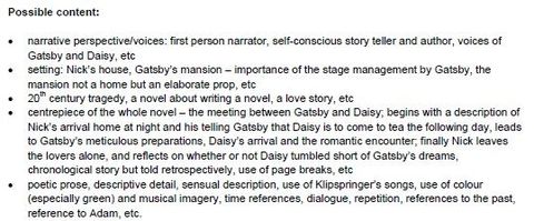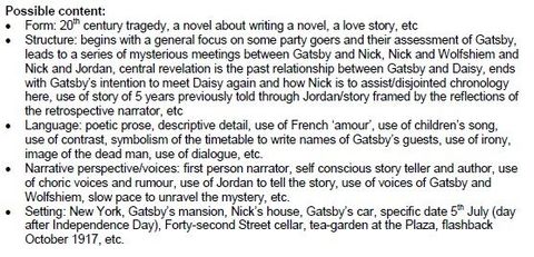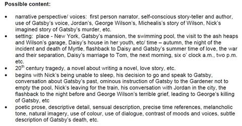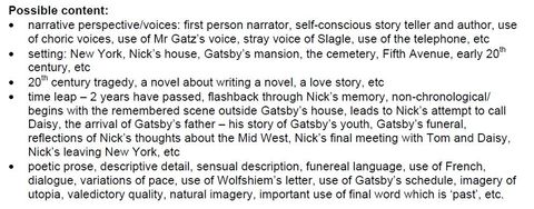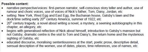 Notes from the exam board giving suggested content for the Section A, Odd question on LTB1 (The Great Gatsby).
