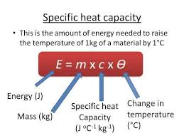 | specific heat capacity formula and question? the specific heat capacity of water is 4200J/KgoC. how much heat energy does it take to heat up 5kg of water by 40 degrees. | =5*4200*40 =840000J |