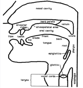 | The Articulatory Apparatus (description) | Lungs: air is pushed out of the lungs Larynx, vocal cords, glottis (space between vocal cords) Vocal tract Articulators: tongue, lips |