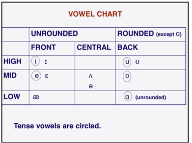 | Tense vowels (examples) | [i] or [ij] heat [e] or [ej] bait [u] or [uw] shoot [o] or [ow] boat [ɑ] lock |