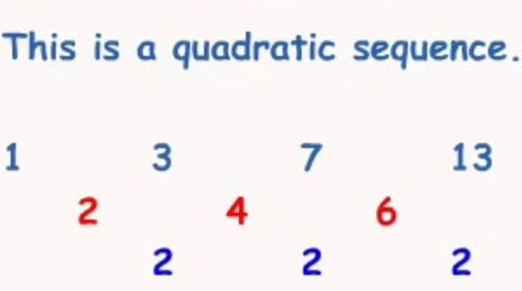 | What is a quadratic sequence? | When the second difference is constant, you have a quadratic sequence - ie, there is an n2 term. |