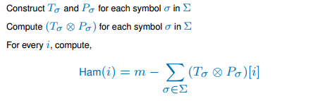 | What is the Hamming Distance Problem? | For every alignment i, output Ham(i), the hamming distance between P and T[i ... i+m-1] |