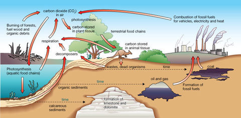 | Carbon Cycle | The series of processes by which carbon compounds are interconverted in the environment, involving the incorporation of carbon dioxide into living tissue by photosynthesis and its return to the atmosphere through respiration, the decay of dead organisms, and the burning of fossil fuels. |