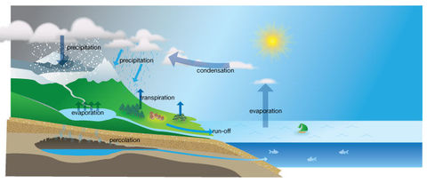 | Water Cycle | the cycle of processes by which water circulates between the earth's oceans, atmosphere, and land, involving precipitation as rain and snow, drainage in streams and rivers, and return to the atmosphere by evaporation and transpiration. |