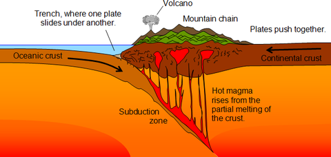 | Destructive Plate Boundry | When oceanic and continental crusts move together. Friction causes the oceanic plate to melt, triggering an earthquake, eg. Nazca and Soth American plate. |
