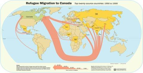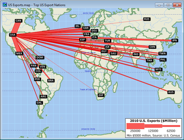 FLOW LINE MAP- represent volume of movement from place to place, line:quantity, along actual route, + clear visual representation - may look overcrowded if too many lines |