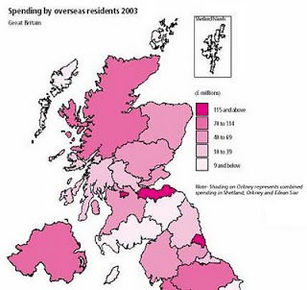 CHOROPLETH MAP- data values represented by density of shading, area in terms of value (e.g. pop density in UK), in classes, + colourful, draws attention, visual, - assumes whole area under one form of shading has same density with no variations, implies abrupt changes as you cross regional borders (not the case) |